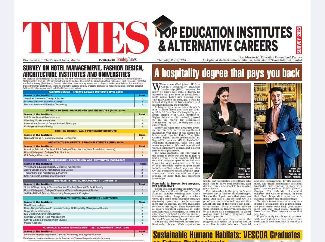 Don Bosco College (DBC), Kurla, has been ranked the No. 1 Hospitality Studies Institute in Mumbai in the Times Top Education Institute Mumbai 2025 survey, conducted by Optimal Media Solutions (Times of India) and Avance. The survey evaluated leading institutes across hospitality, fashion design, and architecture, with DBC leading in hospitality based on academic excellence, student engagement, accreditations, placements, faculty programs, and infrastructure. DBC stood out for its industry-aligned certification courses, state-of-the-art facilities, and diverse hospitality offerings. The college’s consistent focus on practical training, academic rigor, and value-based learning has helped it produce industry-ready professionals. This recognition reaffirms DBC’s commitment to quality education and positions it as a leader in shaping the future of hospitality in India.