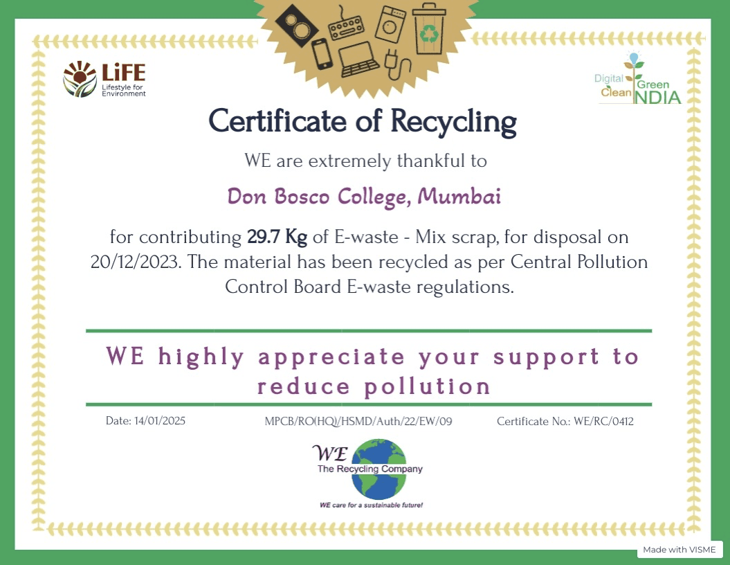 The Don Bosco Green Alliance, in collaboration with the Department of Management and Finance, organized an E-waste Collection Drive at Don Bosco College to promote eco-friendly disposal of electronics. Students, faculty, and staff participated actively, collecting 29.7 kg of items like phones, chargers, cables, and batteries.