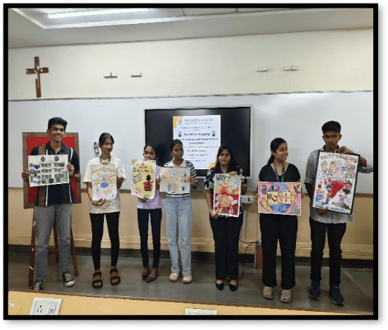 Don Bosco College, Kurla organized a poster-making event during Anti-Ragging Week, led by the Bosco Literary and Cultural Club (BLCC). The event aimed to raise awareness on anti-ragging, gender sensitization, POSH, bullying prevention, and creating a safe campus. Participants were asked to create original posters reflecting their views on these issues. Judged by Prof. Melita Rego and Mr. Vishal Sawakare, seven students showcased creative, meaningful artwork. Each participant explained their poster and shared insights on ragging and campus safety. Ms. Pranjal (SYBAF) secured first place, followed by Ms. Valencia (SYBMS C), making the event both impactful and memorable.